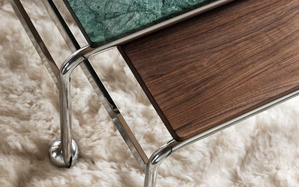 该款略大型桌子基于 Bruno Mathsson 的原创桌子,用于搭配他设计的经典坐椅,提供较大的表面空间,同时具有与 Karin 系列相同的优雅美感。镀铬框架采用高级大理石、或胡桃木饰面。