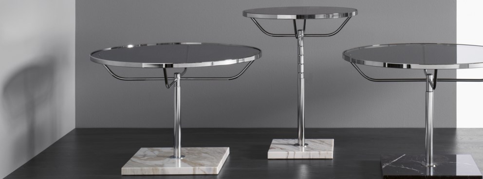 经典的镀铬圆桌,桌面直径较大。 设有手动高度调节和大理石底座。